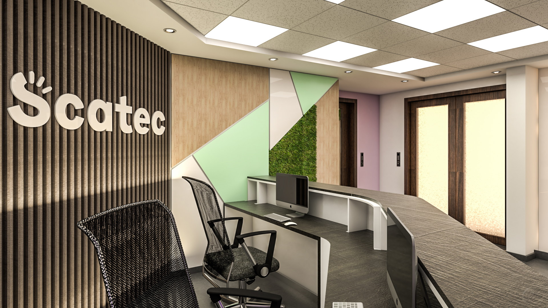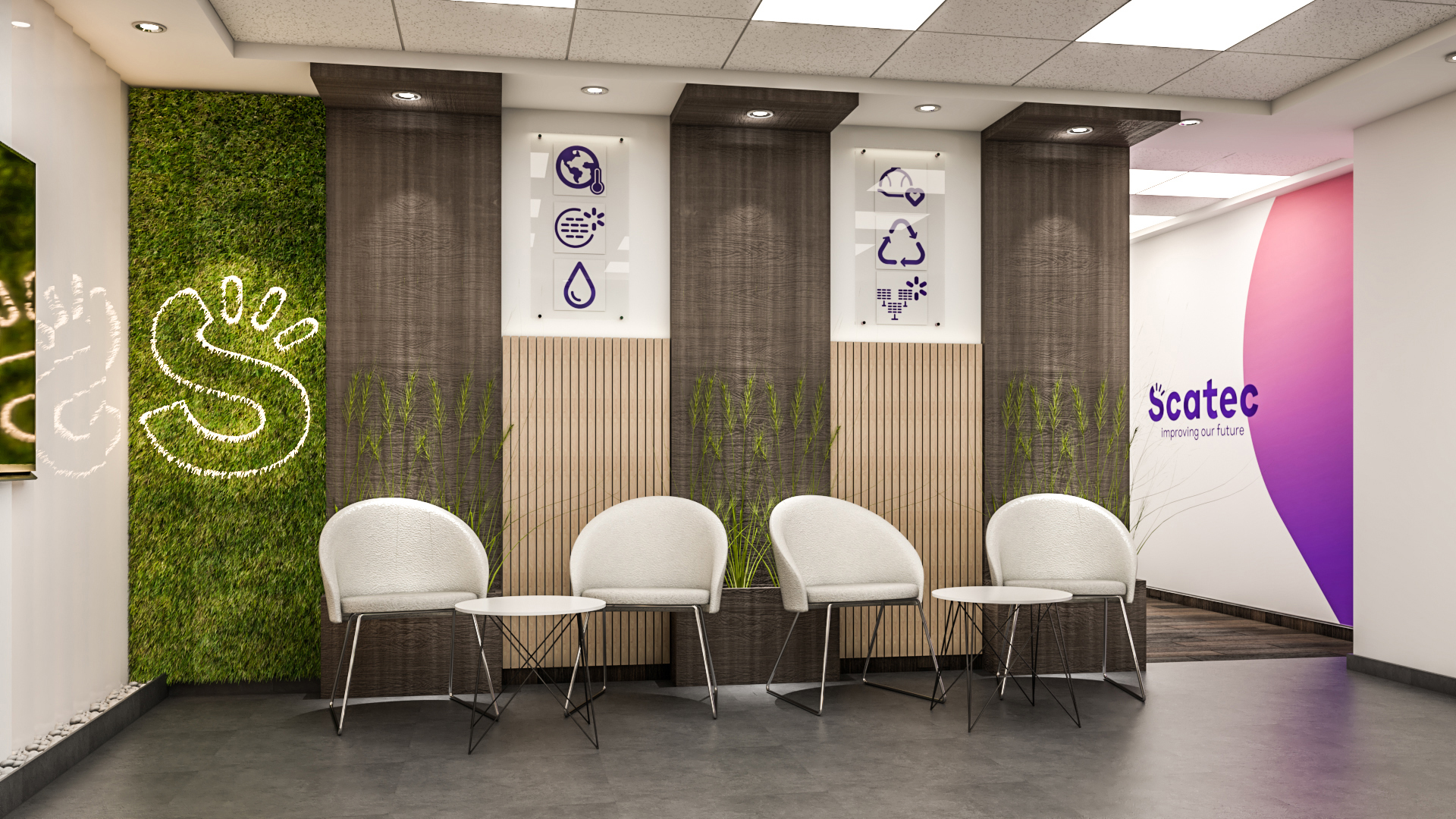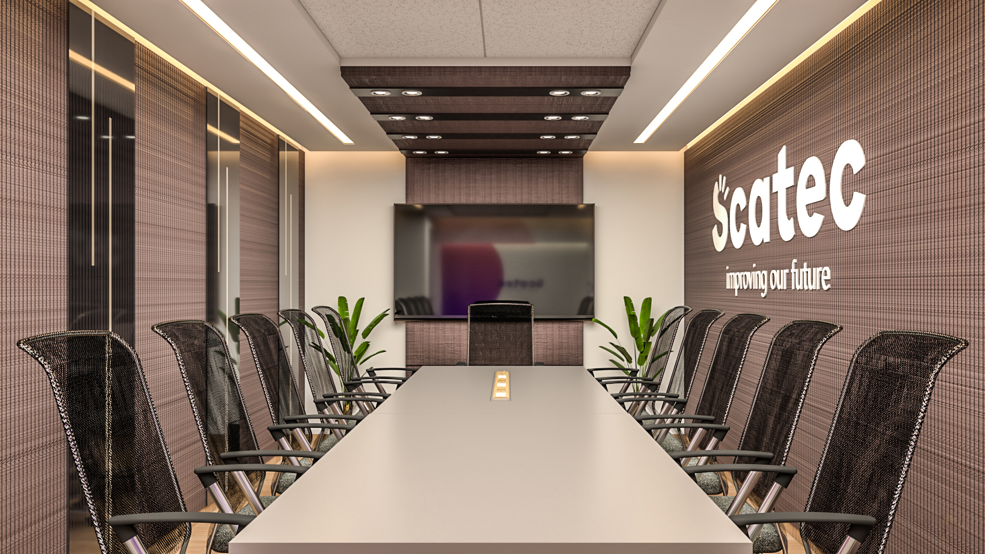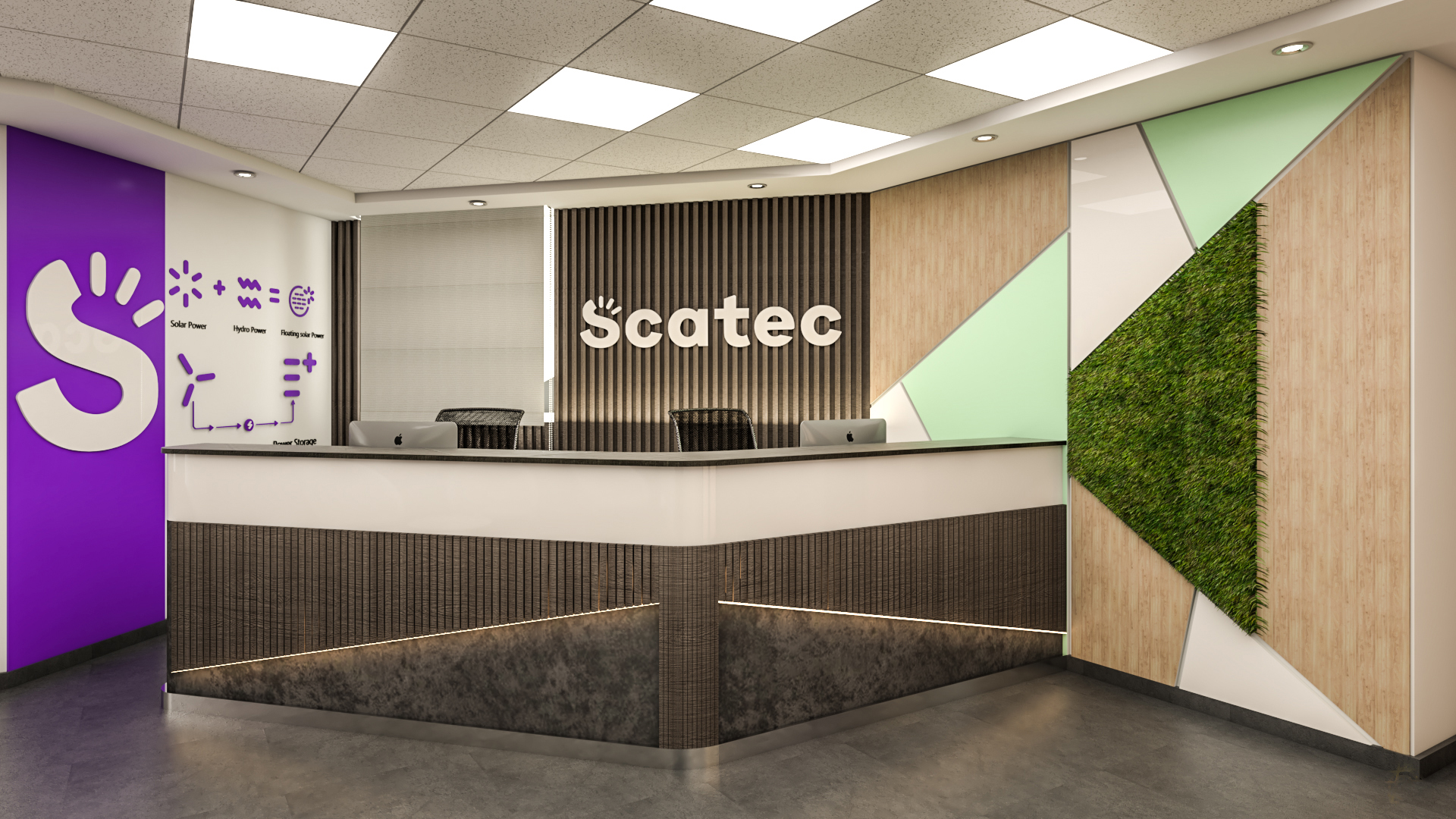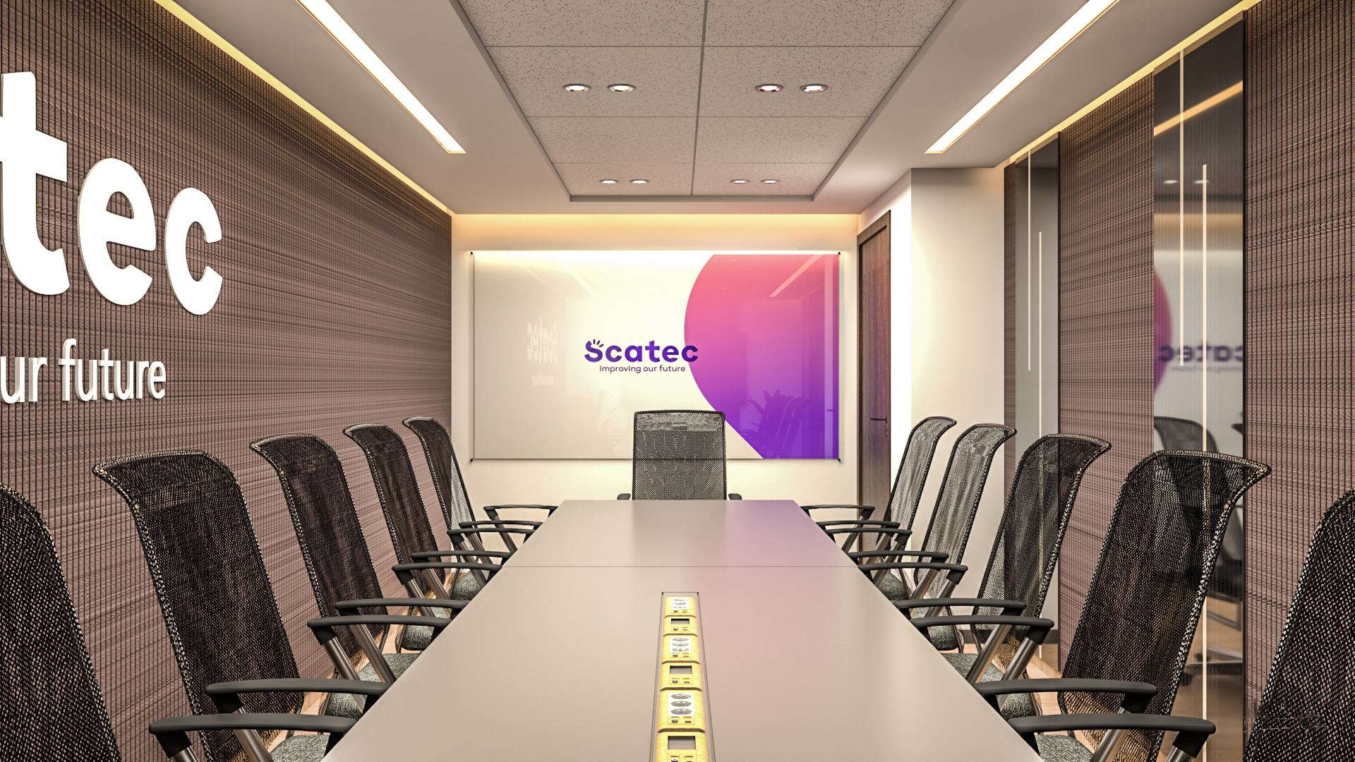 Corporate office design for SCATEC, emphasizing sustainability and professional elegance in every detail.